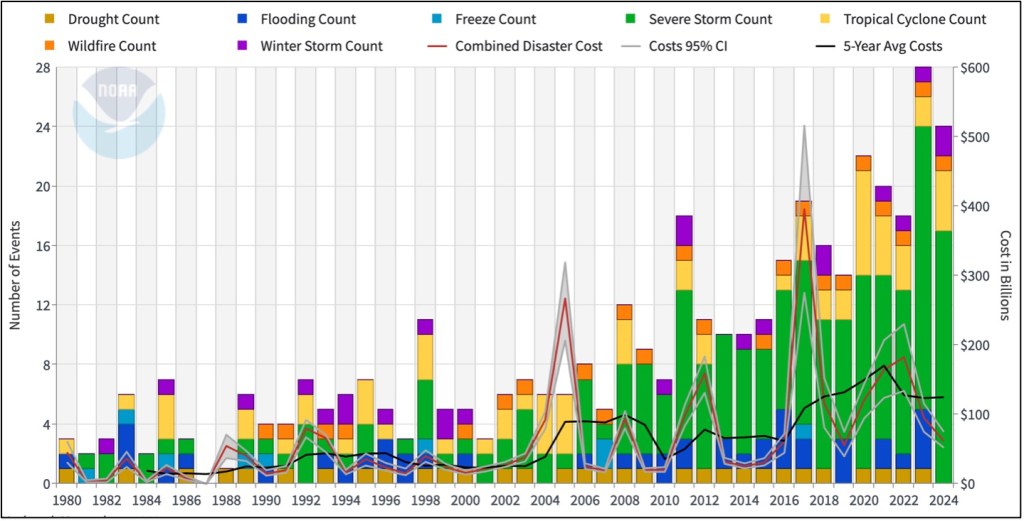 The number of major droughts, floods, hurricanes, wildfires, and other weather and climate-related disasters in the U.S. has increased dramatically over the last forty years, from an average 3.3 per year in the 1980s to 17+ from 2014 through 2024. This year is turning out to be one of the worst on record. As of November 1, 2024, the National Oceanic and Administration (NOAA) has registered 24 weather and climate disasters with losses exceeding $1 billion. Of course, though a common metric of disaster severity, economic impact is just one dimension of harm. Globally, natural disaster frequency has exhibited a similar pattern. According to the International Disaster Database (EM-DAT), major disaster events have increased from 100 per year in the 1970s to around 400 events per year in the past 20 years.